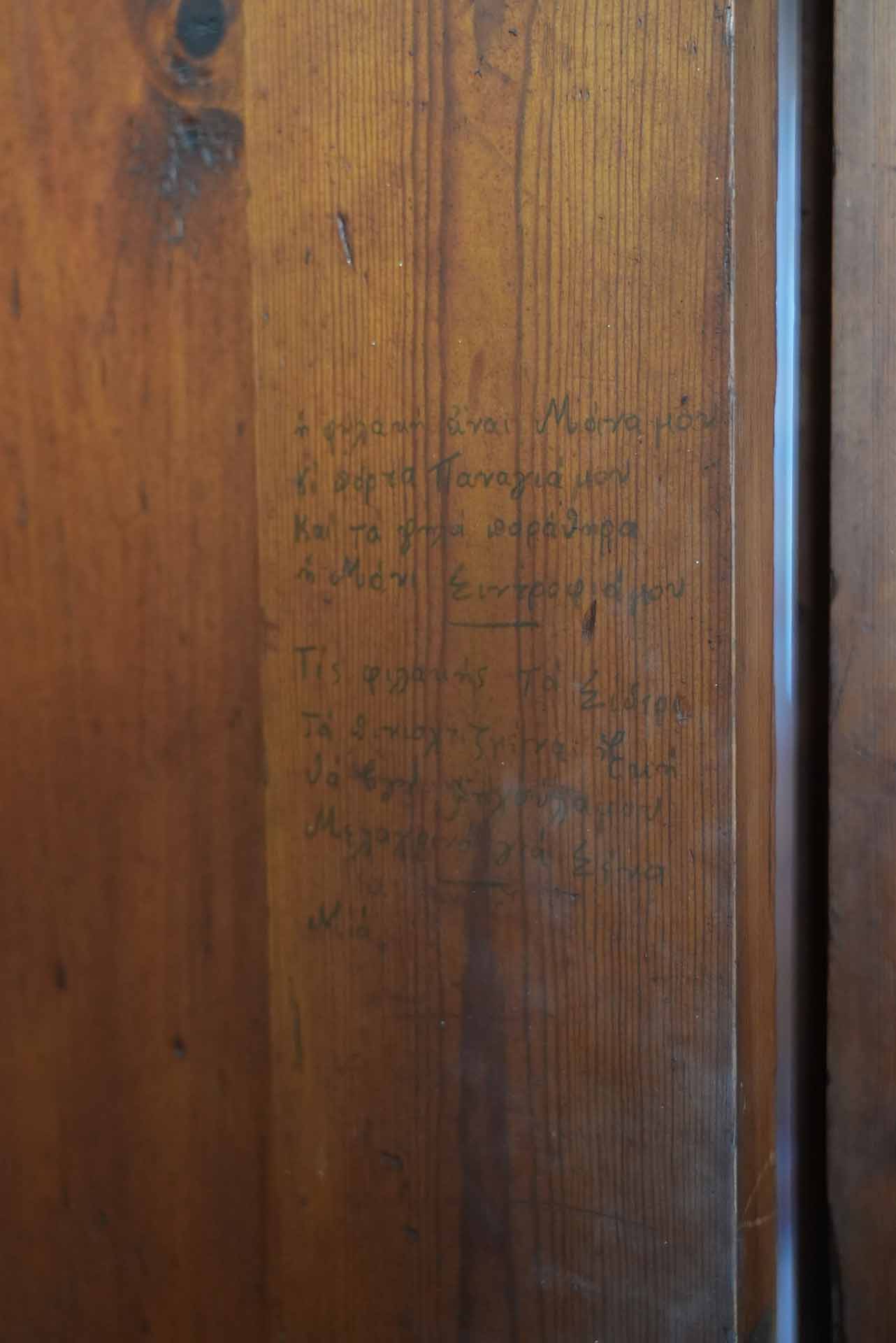 During the German occupation, the building was requisitioned by the occupying forces and used as a prison. Even after the liberation of Greece, it continued to serve as a prison. Messages carved into its wooden interiors by prisoners remain visible as poignant reminders of its history. In the 1950s, the property was returned to Limnios’s daughter.