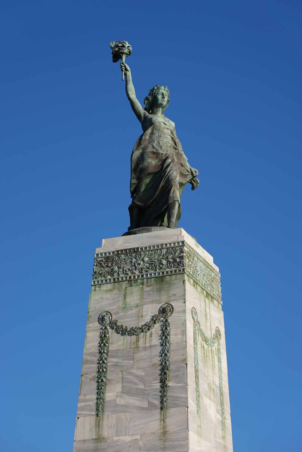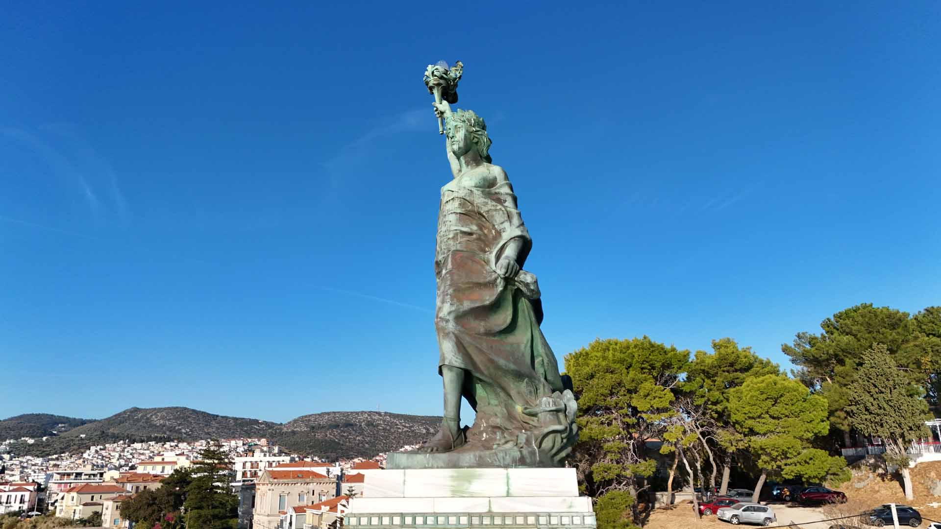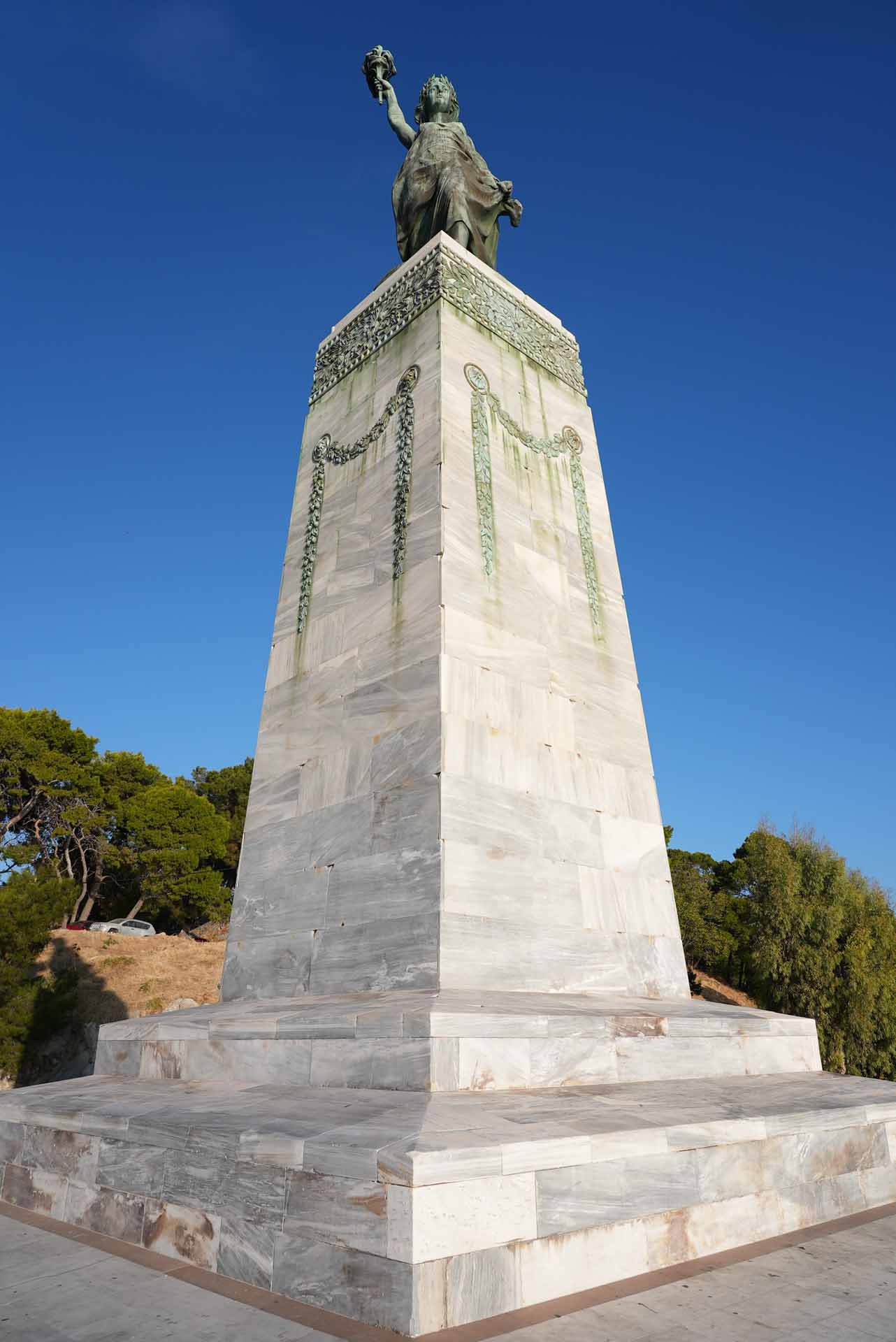 Το 1924 κατέφθασε στο νησί με φορτηγίδα το ορειχάλκινο άγαλμα από τη Γερμανία. Για αρκετό διάστημα παρέμεινε συσκευασμένο, ώσπου επανέφερε το θέμα της ανέγερσής του ο Μητροπολίτης Μυτιλήνης Ιάκωβος Α’ από Δυρραχίου. Τελικά, τα αποκαλυπτήρια του αγάλματος της Ελευθερίας, που είναι στραμμένο συμβολικά προς την Ανατολή, έγιναν στις 8 Νοεμβρίου 1930. Μεταγενέστερα προστέθηκε μαρμάρινη πλάκα με τα ονόματα πεσόντων του Β’ Παγκοσμίου Πολέμου.
